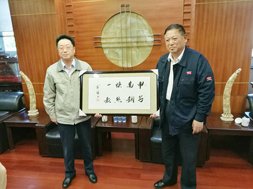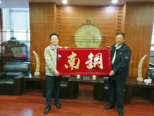 南钢集团建厂六十周年发生巨大变化,从当年的小作坊到今天的现代化国内先进大型钢铁企业、为国家、为员工做出了巨大的贡献。集团在此喜庆之时,向南钢集团赠送金字招牌“南钢”、“甲子南钢、焕然一新”字画,诚表心意。