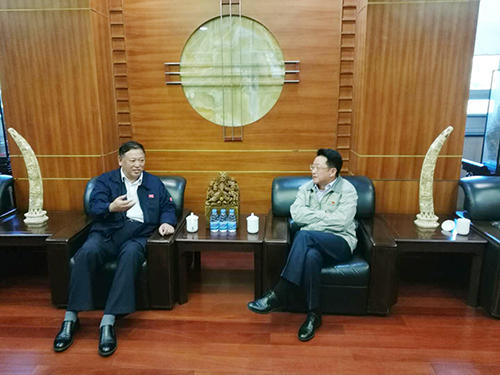 集团董事长卢显忠(左)与南钢集团董事长黄一新(右)亲切交谈