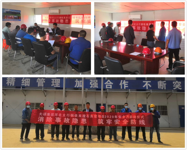【概要描述】2020年6月是全国第十九个“安全生产月”。近日,为切实做好“安全生产月”活动开展,星辉平台公司各项目部开展“安全生产月”启动仪式,传达集团安全生产相关文件,制作安全警示展板,将安全教育培训和施工生产实际相结合,组织对各施工现场进行检查,排除隐患,切实把“安全生产月”活动做到常态化,推动星辉平台公司安全生产新局面。 星辉平台太行钢铁石灰窑项目部 星辉平台石横特钢石灰窑项目部 星辉平台广西源盛矿渣微粉项目部 星辉平台敬业高炉喷煤项目部 星辉平台吉林鑫达焦化一期烟气净化工程项目部 星辉平台潍坊特钢喷煤项目部 星辉平台酒钢7#喷煤项目部 通讯员:徐祇辰