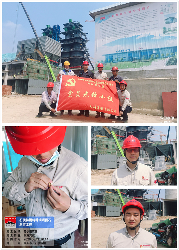 【概要描述】2020年6月,星辉平台公司总承包石横特钢石灰窑项目进入了攻坚阶段,土建、钢构、设备、电气及耐材砌筑队伍等近300人正全力以赴,加紧施工。 为了突出党员在工作中的带头作用,树立党员先锋形象,项目部决定成立党员先锋队。该工作得到了业主及监理公司的肯定和支持。2020年6月21日,由星辉平台、石横特钢、鲁冶监理公司石灰窑项目部的党员组成的党员先锋队正式成立。 戴党徽、亮身份、树先锋,党员先锋队将在今后