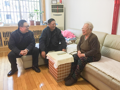【概要描述】11月12日,集团董事长卢显忠、总裁杜刚在沈阳出差,并走访老员工宋群家庭,与宋群副部长年迈的老母亲进行亲切交谈。卢董事长向老人家介绍了企业情况,与老人家话家常,祝福她健康长寿。