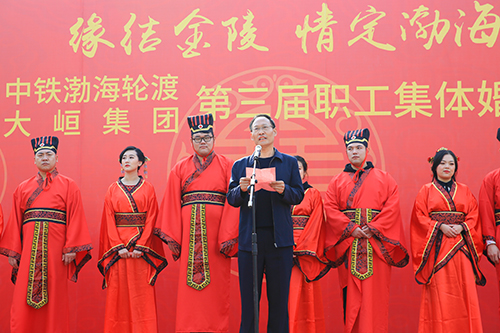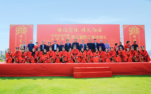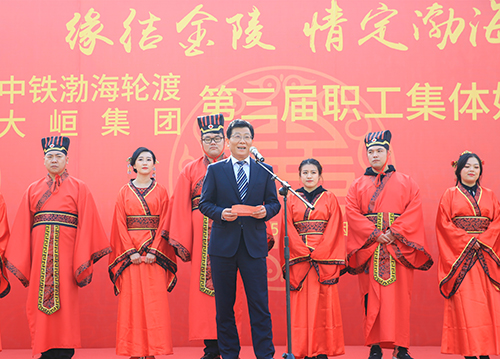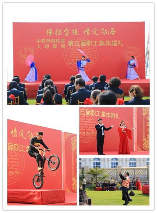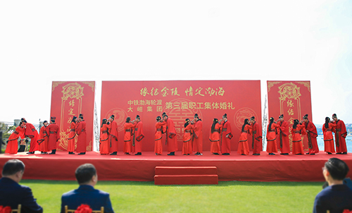 10月25日上午,蓝天、白云、绿草、一望无际的大海,十二对新人身着中式喜服,在悠扬古典的乐曲和热烈的掌声中,缓缓走入舞台中央,接受大家诚挚的祝福。婚礼过程中,朱炳安与武祥林这两位党委书记分别代表本单位作了讲话,卢显忠董事长与刘君总经理作为新人的大家长为他们送上了精美礼品,中铁渤海轮渡公司文工团精心准备了节目。