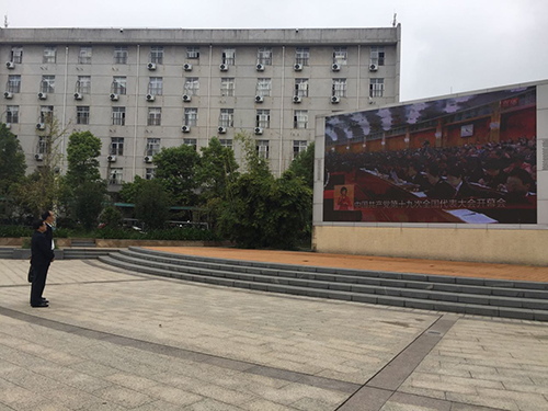 公司党委书记朱炳安,纪委书记、工会主席曾巍在江西理工大学招聘现场观看十九大开幕式